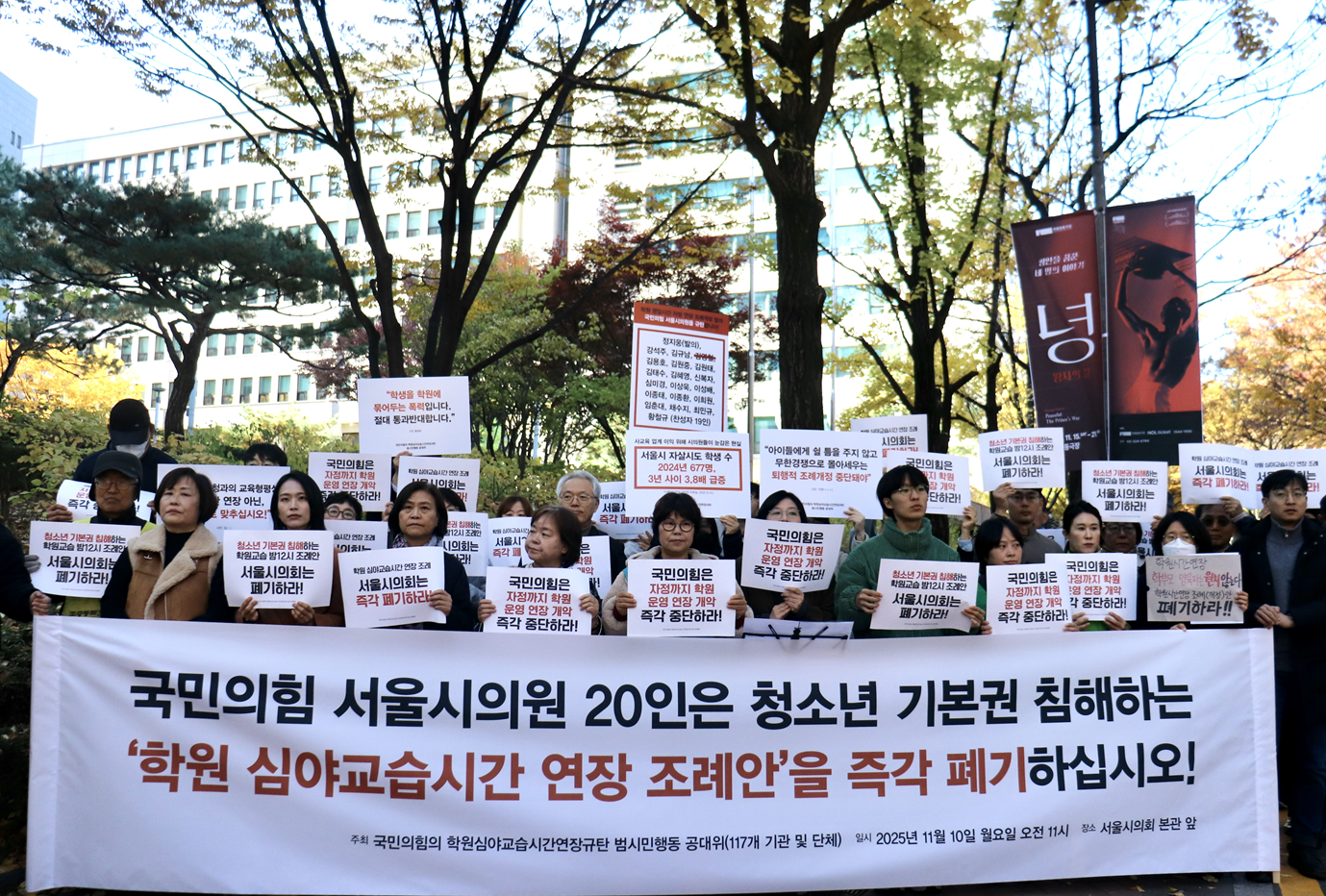 ‘국민의힘의 학원 심야교습시간 연장 규탄 범시민행동(119개 기관 및 단체)’은 국민의힘 서울시의원 19인이 발의한 학원 심야 교습시간 연장 조례안의 즉각 폐기를 촉구하기 위해 오늘(11월 10일(화)) 오전 11시에 서울시의회 의원회관 입구에서 기자회견을 개최하였습니다.