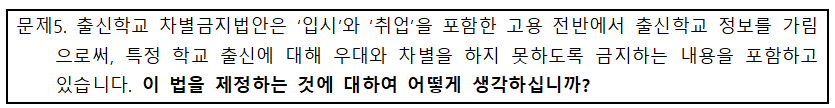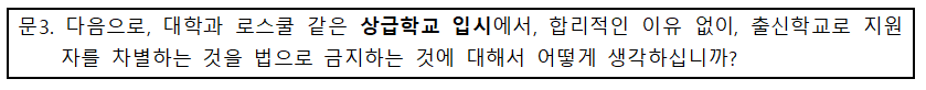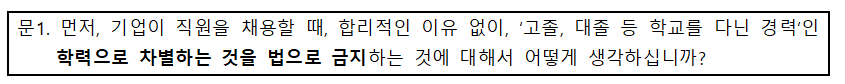 ■ 이번 여론조사 결과를 반영하여, 국회 교문위 법안소위는 11월 22일에 ‘출신학교 차별금지법률안’을 반드시 통과시켜 줄 것을 요청함.