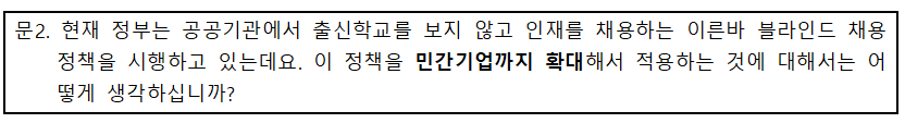 정부는 현재 공공기관에서 출신학교를 보지 않고 인재를 선발하는 블라인드 채용 정책을 시행하고 있습니다. 하지만 민간기업에는 권고 정도를 하는 수준에 그치고 있습니다. 이는 출신학교 차별을 법 제도로 규제하는 것이 민간기업의 사적 자치 영역에 대한 과도한 규제라는 반대의견이 존재하기 때문입니다. 하지만 설문결과에도 보이듯 75.7%의 국민은 출신학교를 보지 않고 인재를 선발하는 블라인드 채용 정책을 민간기업까지 확대해서 적용해야 한다고 응답했습니다.
