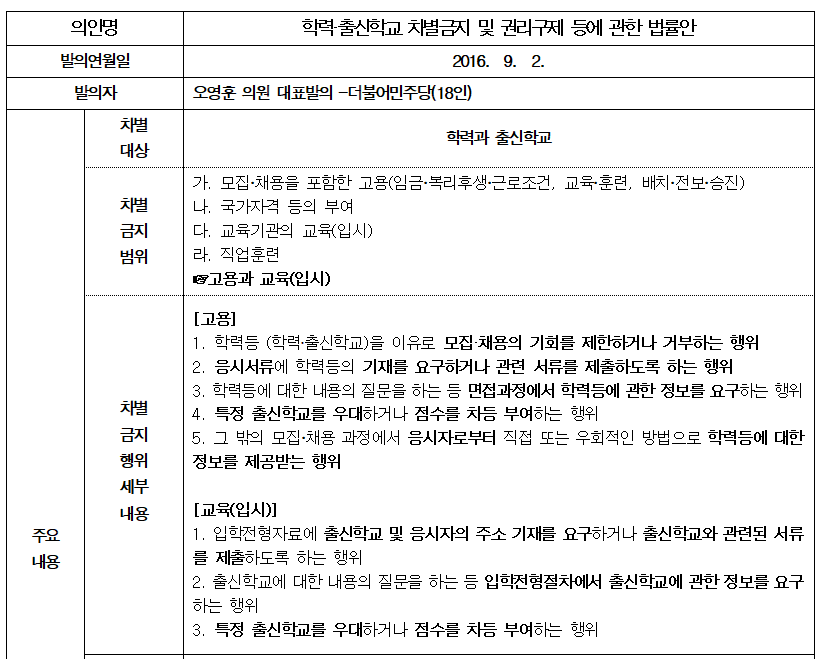 ‘출신학교 차별금지법률안’은 입시와 고용에서 출신학교(학력, 학벌 개념 포함)를 이유로 한 차별행위를 금지하는 내용을 핵심적으로 담고 있습니다. 법안의 주요 내용은 다음과 같습니다.