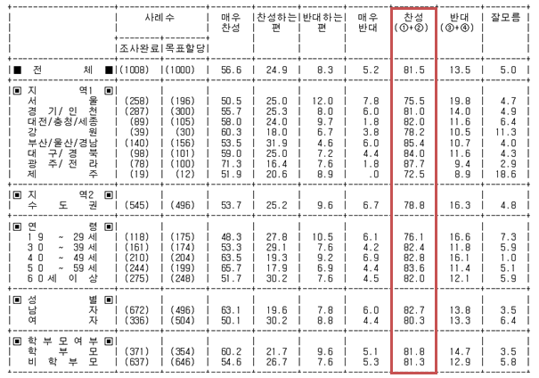 특히 상세조사표에 의해 지역과 연령, 성별과 학부모 여부를 초월하여 압도적인 지지를 받았음을 확인하였습니다.