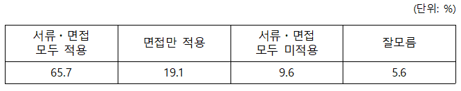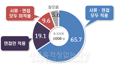 현재 정부는 출범 초기 100대 국정과제의 입시 영역에서 ‘블라인드 면접’을 도입하겠다고 밝혔습니다. 구체적으로 대학 입시에서는 출신 고교 블라인드 면접을 도입하고, 법학전문대학원(이하 로스쿨) 입시에서는 블라인드 면접을 의무화할 것이라고 밝혔습니다. 하지만 면접에서만 출신학교를 가리고 지원서류에서는 출신학교를 심사할 수 있다면 그 한계가 분명합니다. 지난 2016년 한양대 로스쿨의 출신학교 등급제 파문은 서류전형에서 비롯된 것이기 때문입니다. 이번 조사 대상자의 65.7%가 입시에서 서류・면접 과정 모두 출신학교를 보지 않아야 한다고 응답하였습니다.